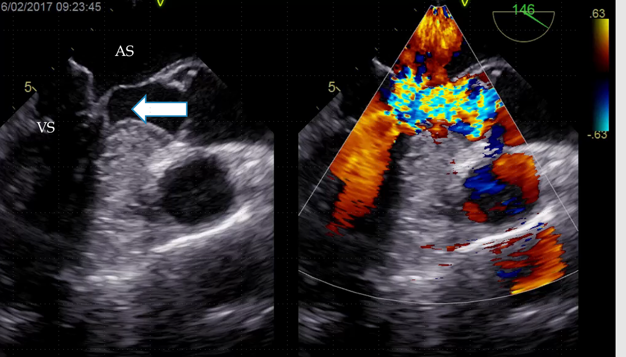 Figura 7. Rezultatul postoperator la ecografie transesofagiana. Nu mai există obstrucție la ieșirea din VS iar regurgitarea mitrală este minimă.
