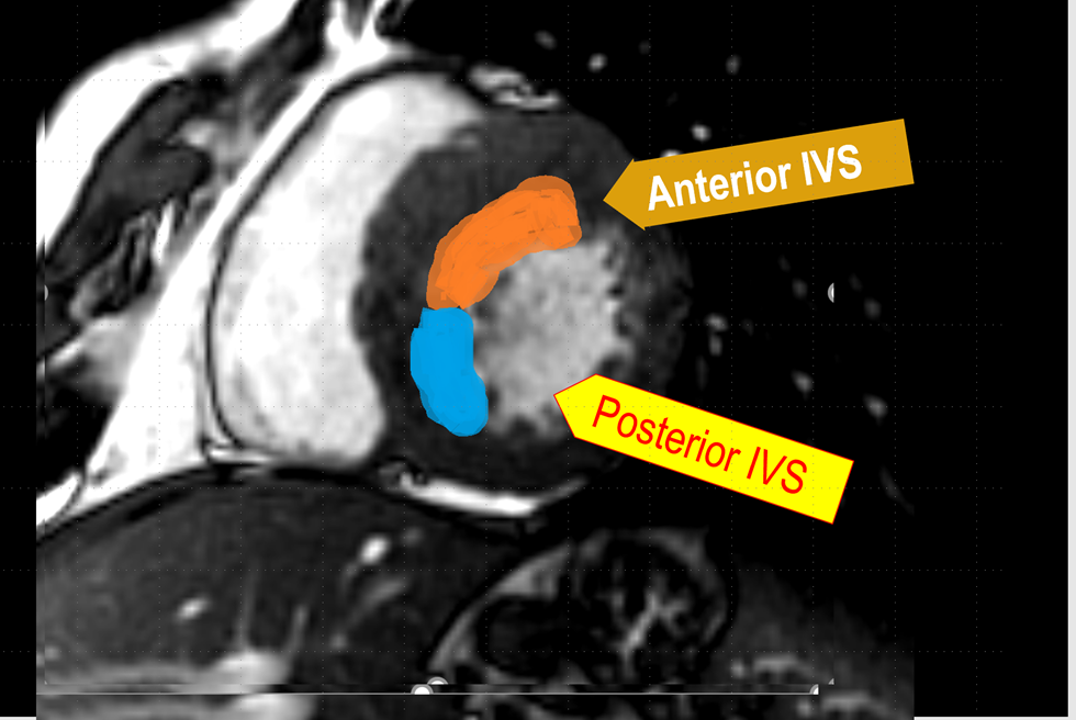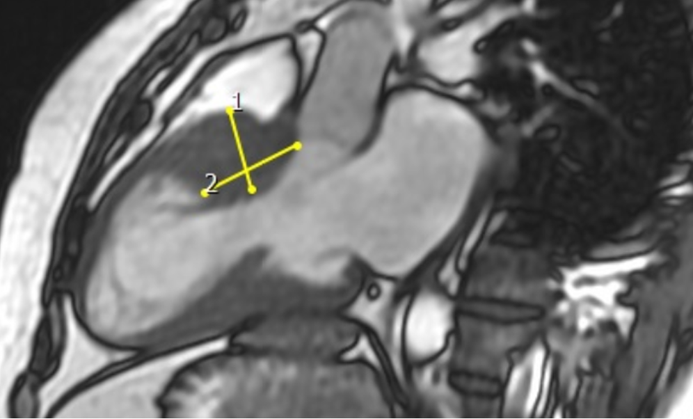 Figura 2. Masurarea grosimii mușchiului cardiac în zona care determină obstrucția în vederea miectomiei (eliminării mușchiului în exces). Măsurătorile sunt făcute pe imaginile de rezonanță magnetică, care oferă o rezoluție excelentă, evitându-se astfel pericolul unei secționări în exces, care ar duce la perforarea mușchiului.